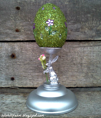Then I just put them both together, stuck some faux flowers in that cute rabbits paws, put a beautiful beaded egg on top and snapped a few pictures for you.