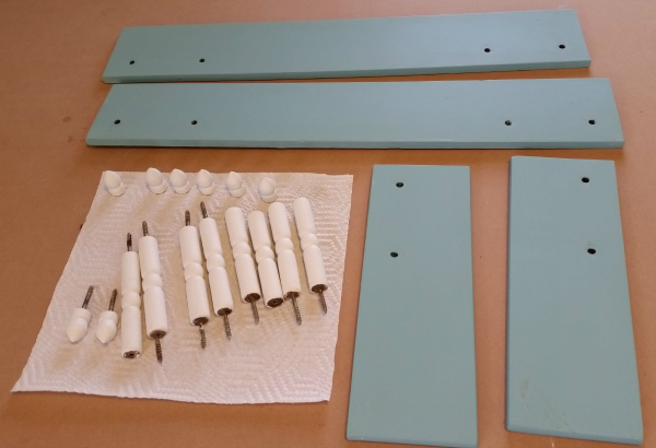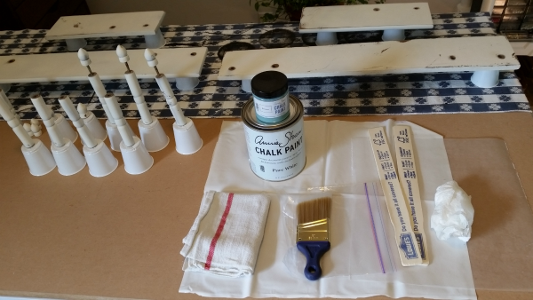 I used Annie Sloan Pure White and Provence. I found that little bathroom cups work quite nicely to hold small spindles and spindle caps for painting.