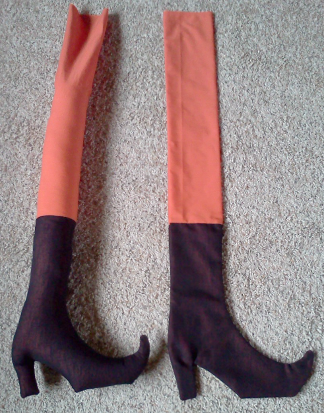 Now I told you my awesome friend Judy made mine for me, and they are way better than my plan, which was to use some tights and stuff them inside a pair of kids boots. I like her idea better. Those curvy toes and high heels on the boots are just perfect! I stuffed the legs with poly-fill. In the above photo, you can see one stuffed and the other is not....because I was so excited to finally do this project that I realized that I had not taken a "before" pic of the legs. Stuff em as tight as you can without ripping the seams.