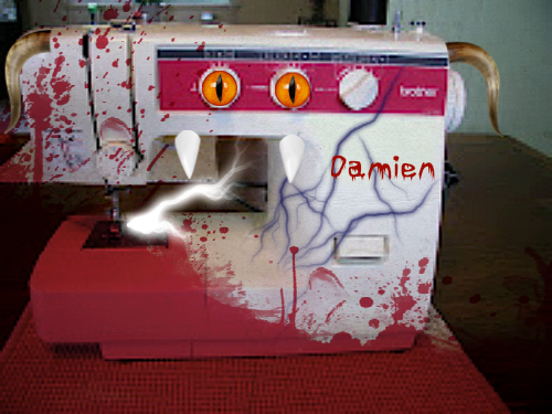 Ummmmmmmmm....sewing machine....devil....scared.....evil.....horns....goat eyes.....blood and gore....nice legs. :)